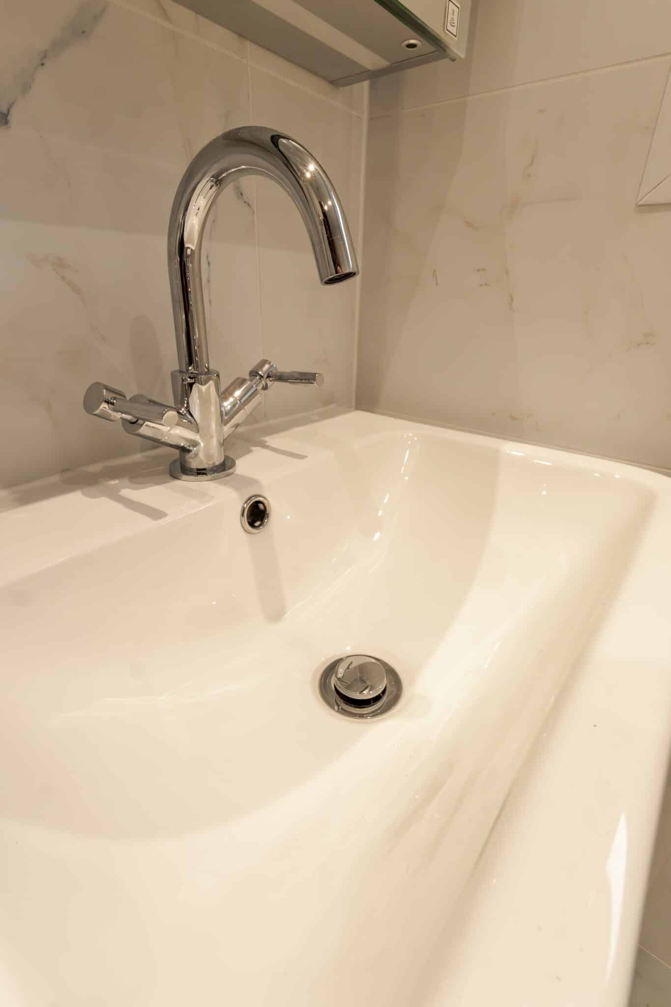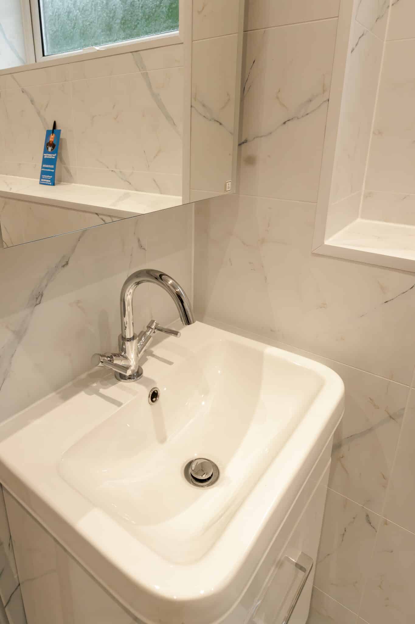 We removed the existing bath and walk-in shower to create a fully level access wet room. Anti-slip flooring was installed to improve safety underfoot, along with wall panelling for a clean, low-maintenance finish. A new sink and mirror were fitted to complete the space, and a heated towel rail was added for everyday comfort.