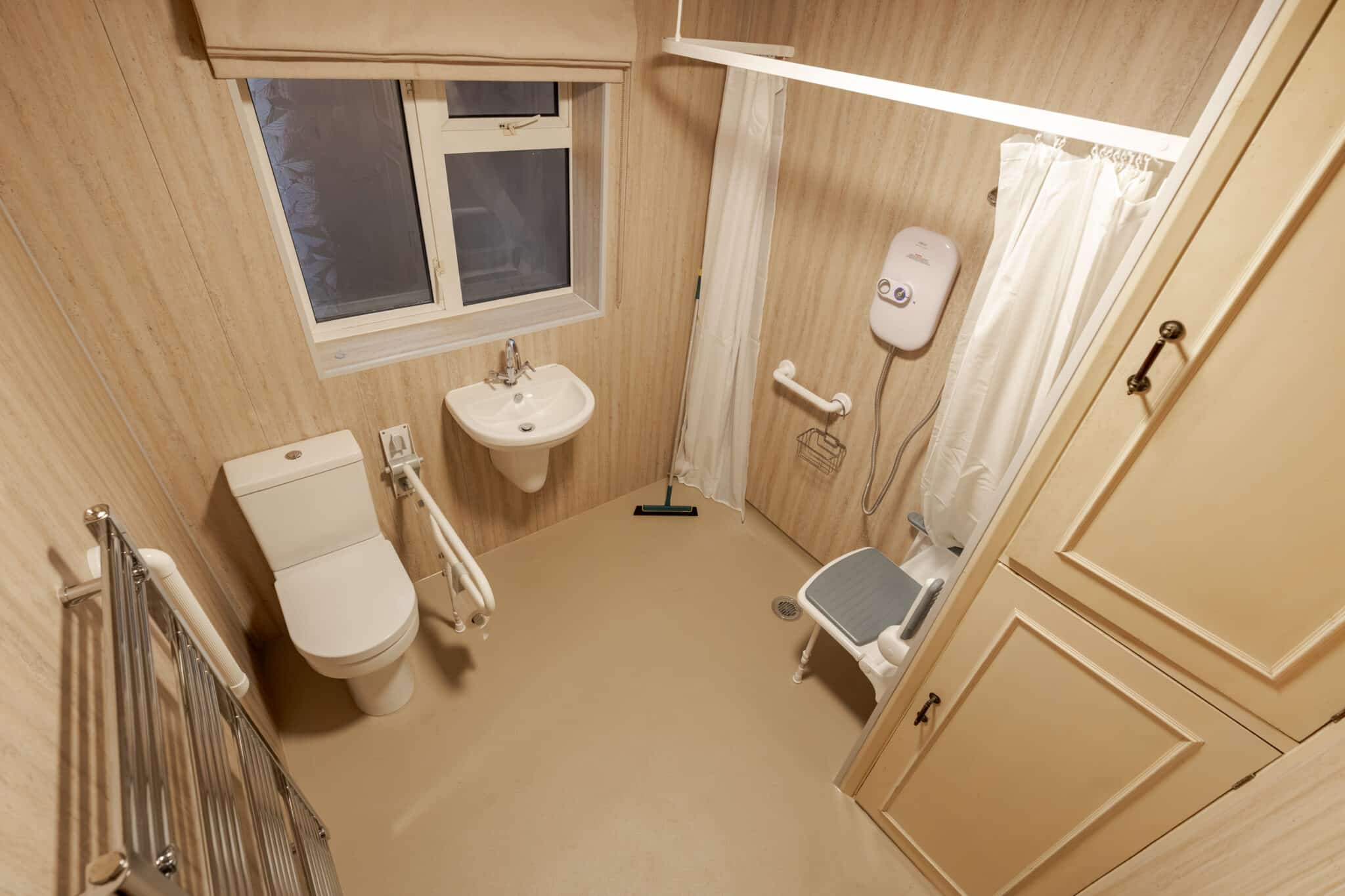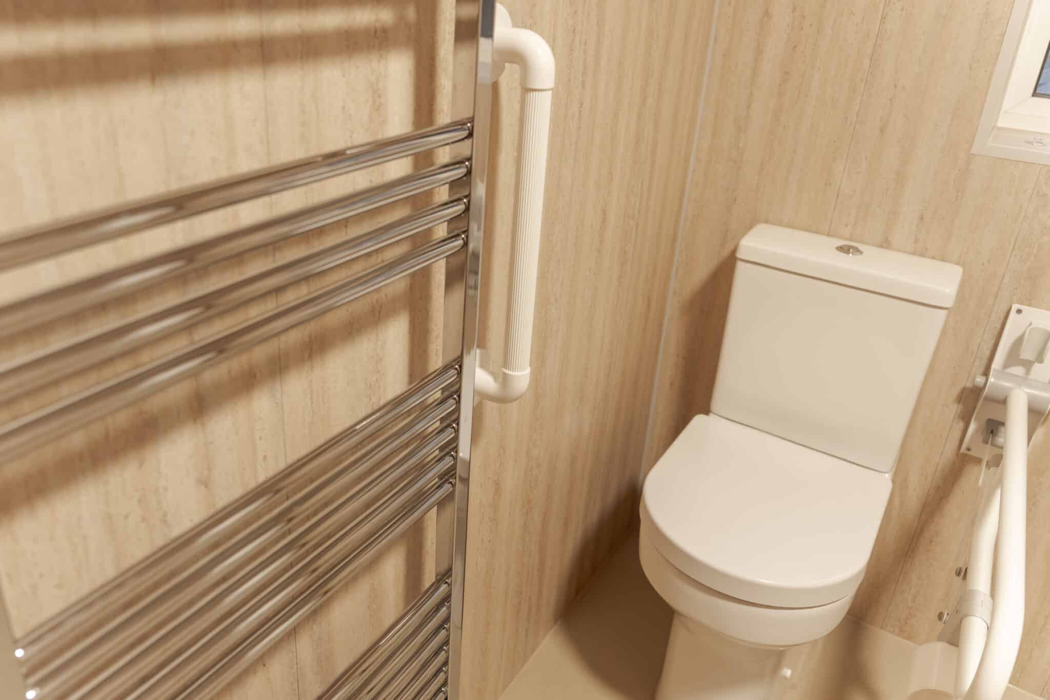 To create a safer and more accessible space, we carried out a full wet room installation. The bath was removed and replaced with a level access shower area, complete with anti-slip flooring to reduce the risk of slips. We installed strategically placed grab rails and drop-down support arms to provide stability where it is needed most, along with a drop-down seat for added comfort during showering. Thermostatic taps and a thermostatic shower were fitted to maintain consistent water temperature and improve safety, while a heated towel rail adds both warmth and convenience.