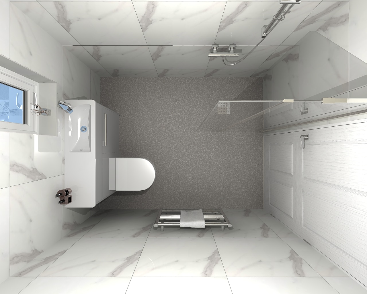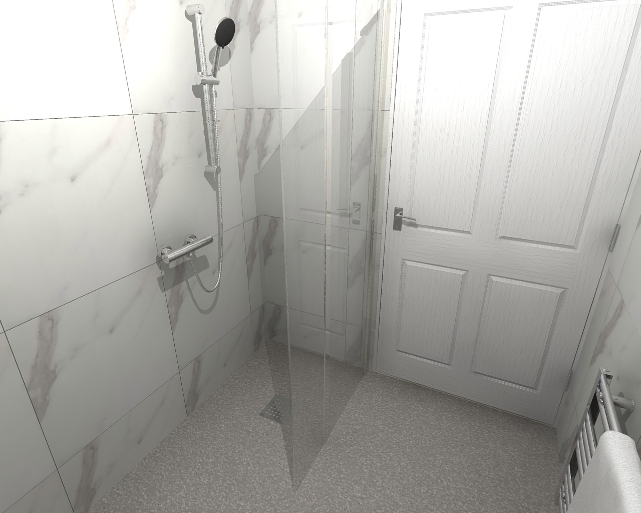 To meet Sophie’s needs, we removed the old fixtures and completed a full wet room installation. This involved tanking the room and creating a seamless, level access floor, completely removing the hazardous step.